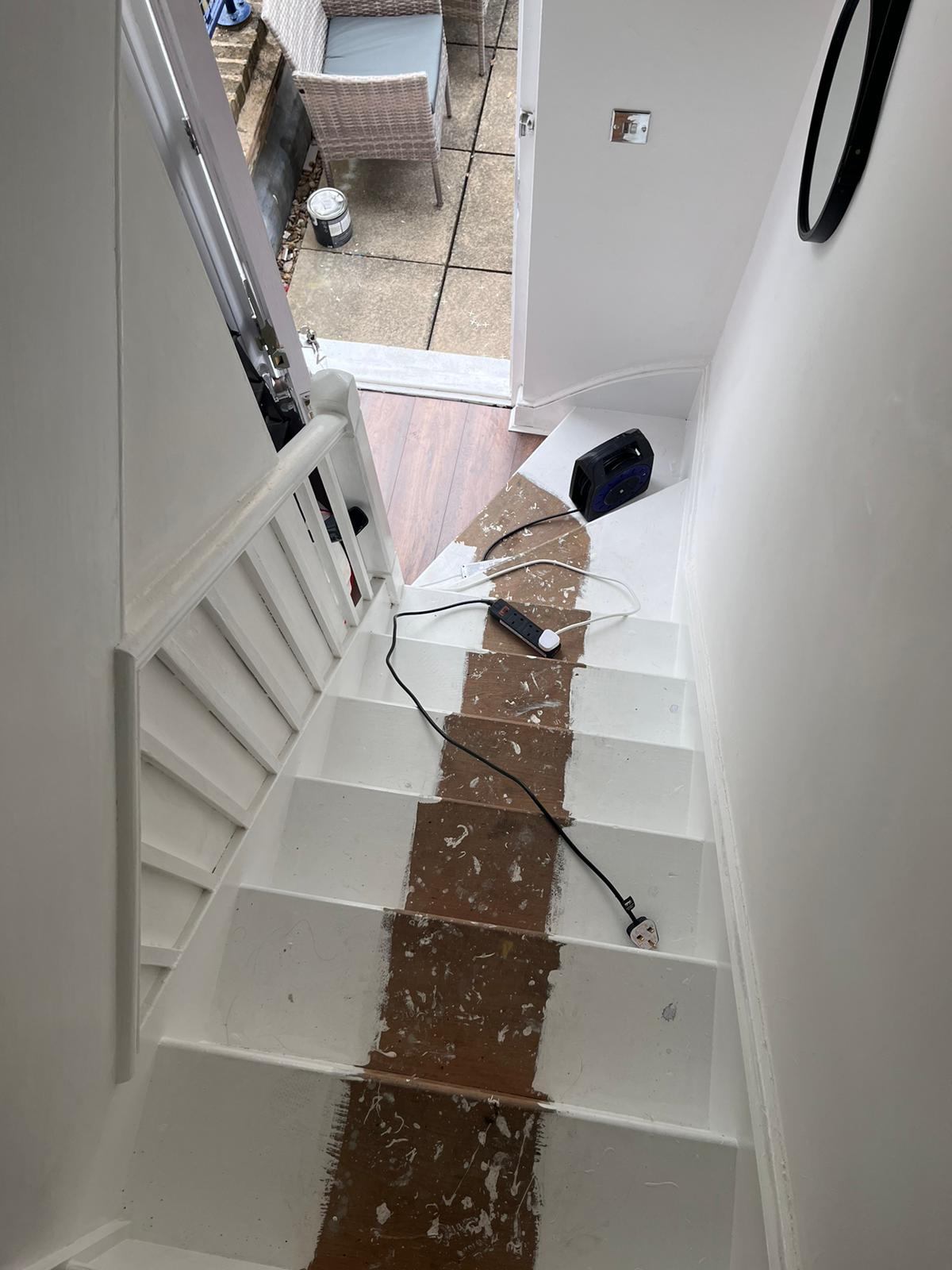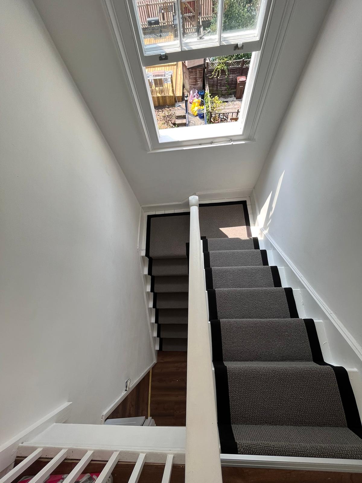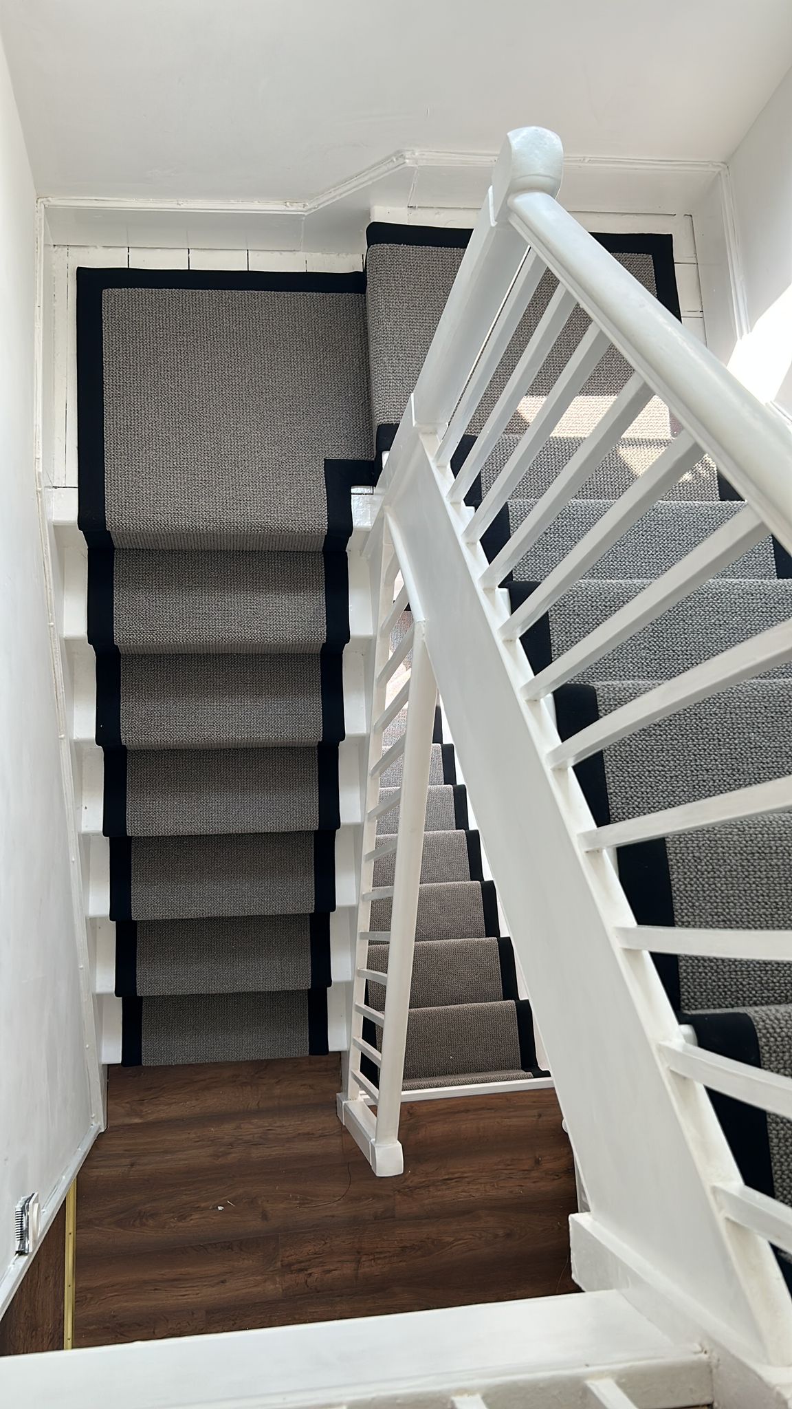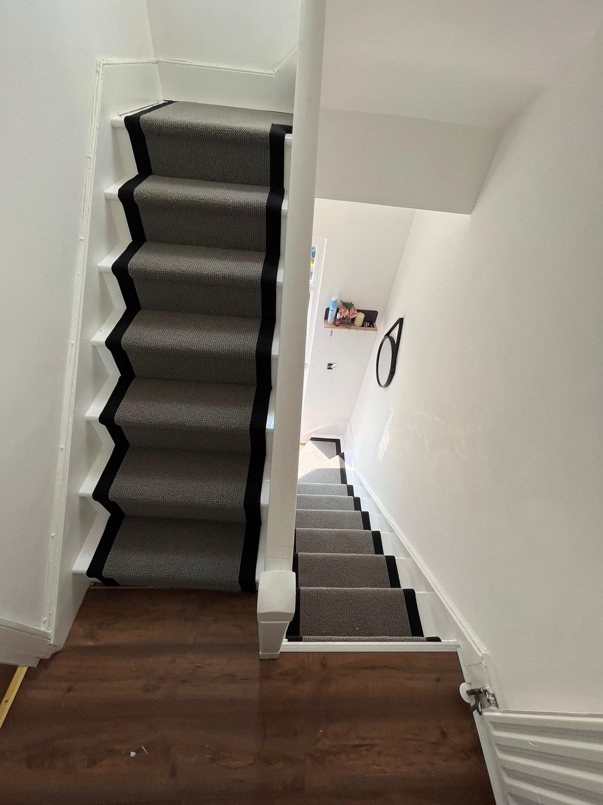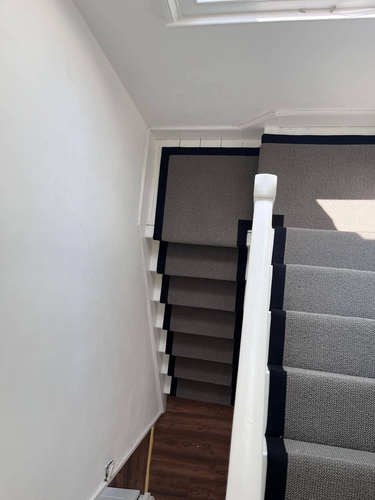 This is a stair runner project with tapped edges. The carpet is 100% wool.